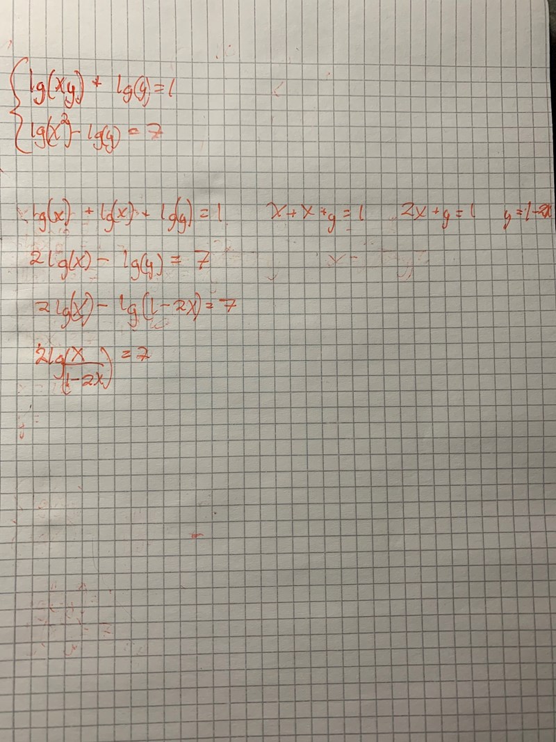 Sen, för att inte förvirras av logaritmerna, föreslår jag att du substituerar, dvs byter ut, lg(x) mot a och lg(y) mot b i dina två ekvationer.