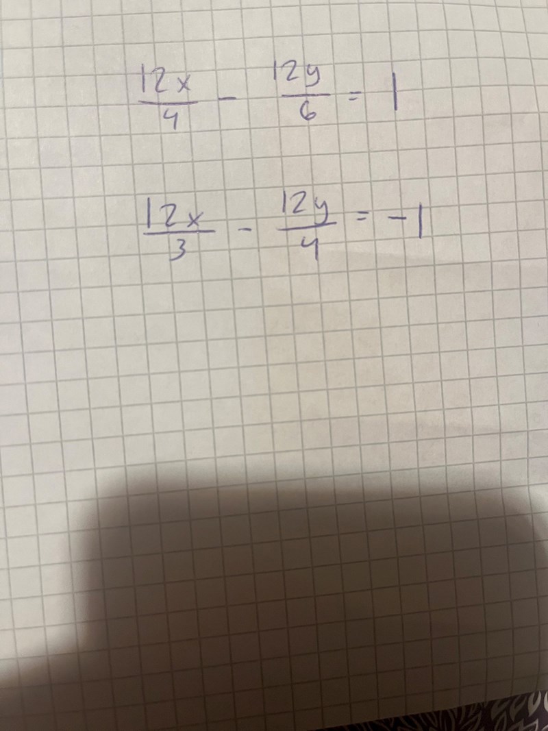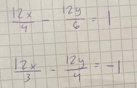 Börja med att multiplicera båda ekvationerna med 12, så får du mycket enklare siffror att räkna med.