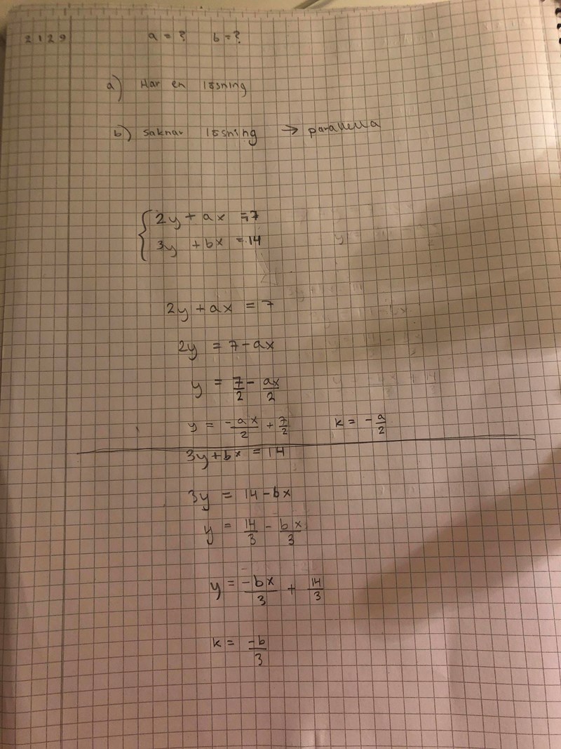 Jag förstår att det gällande b) ”saknar lösning” innebär att de ska vara parallella.