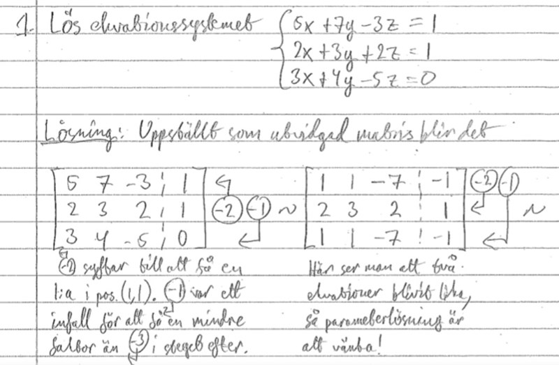 Laguna skrev:Här har någon varit lite smart och först fått fram ettor. Annars, om det står 2 på en rad och -3 på en annan, så får man multiplicera den första med 3/2 och addera till den andra.
