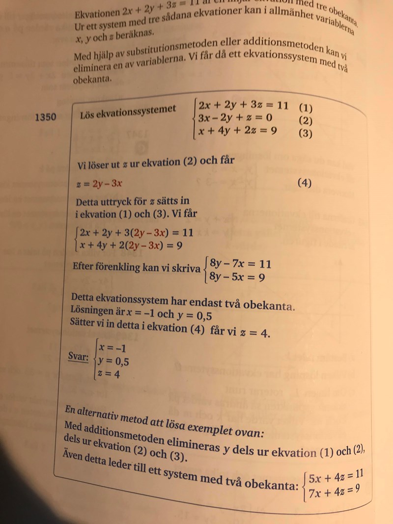 Jag förstår och kan göra lösningen som de gör i exemplet. Det är den alternativa metoden som jag inte kan utföra. Kan en av er här på forumet redovisa en sådan lösning för mig? Jag kan utföra beräkningen med två obekanta med additionsmetoden, men vet icke hur man gör en lösning med tre obekanta.