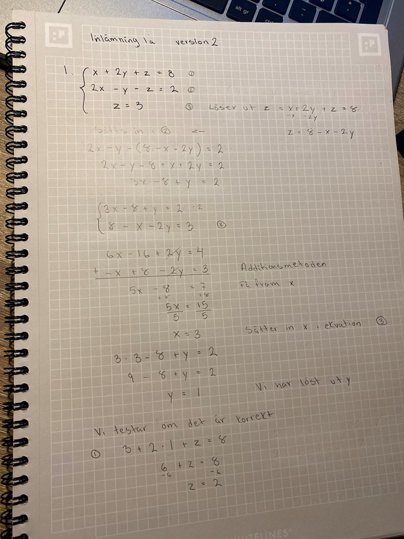 En annan (enklare ?) lösningsmetod är att i använda informationen z=3 i de två första ekvationerna direkt