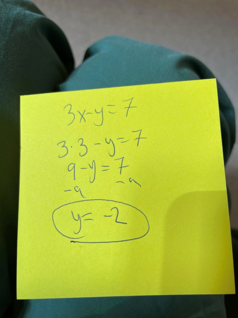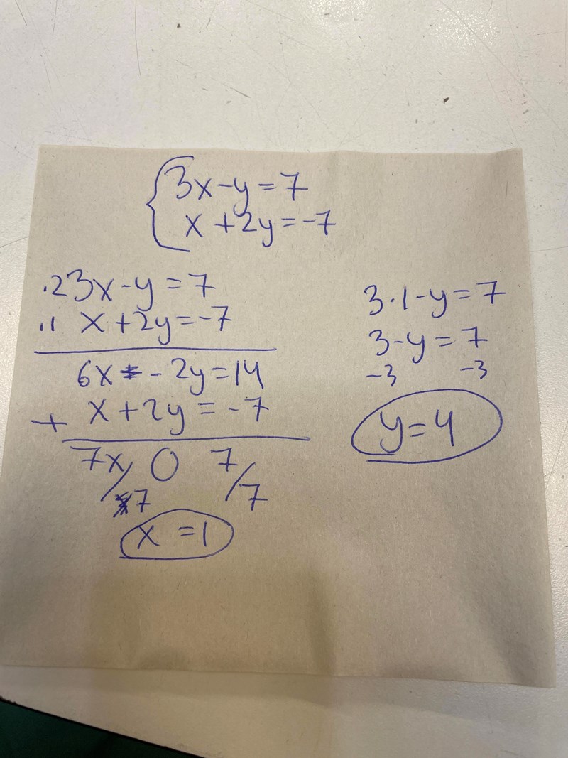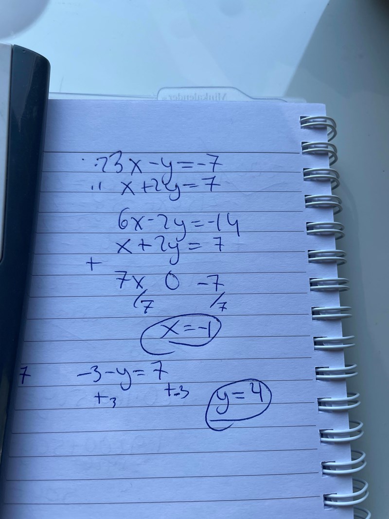 Jag har fastnar här, jag kan alla andra uppgifter men så fastnar jag på denna. Jag vet hur man ska tänka och hur man ska räkna ut det. Men får ändå fram fel svar? Jag får X=3 och Y=2, men svaret är x= -1 och y=4