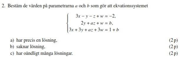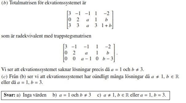 Jag sitter fast på b) och c). Stämmer det att för att ekvationssystemet ska sakna lösningar så måste en rad bestå av enbart nollor, eller hur tänker man här? Och hur tänker man på c)? Det står att det finns oändligt många lösningar om a=1 och b=3 men på b) stod det ju att ekvationssystemet saknar lösningar om inte b=3 då a=1, blev förvirrad av det hela.
