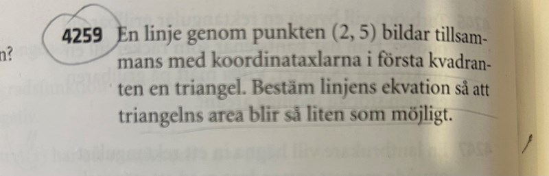 Vi är bara intresserade av x > 2 så enda nollstället är för x = 4. För x > 4 är derivatan positiv och tecknet byts för x = 4. Alltså har triangeln minimal area för x = 4. Det ger att y = 10, så minimal area är 40/2 = 20.