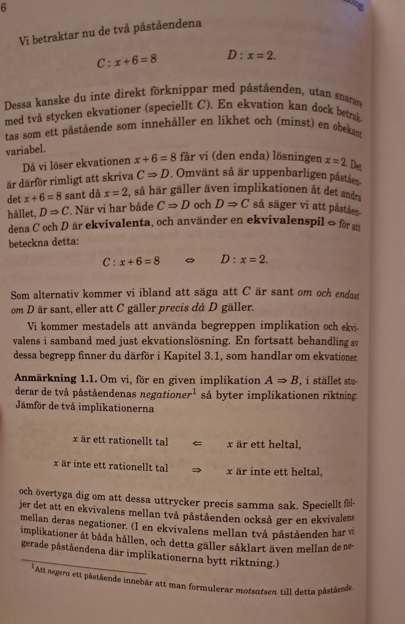 Okej då förstår jag. Hur är det med negrerade påståendet "x är inte ett rationellt tal" => " x är ej ett heltal" ? Då stämmer den generellt? I boken säger de även att det blir ekvivalens även då implikationspilen byter riktning