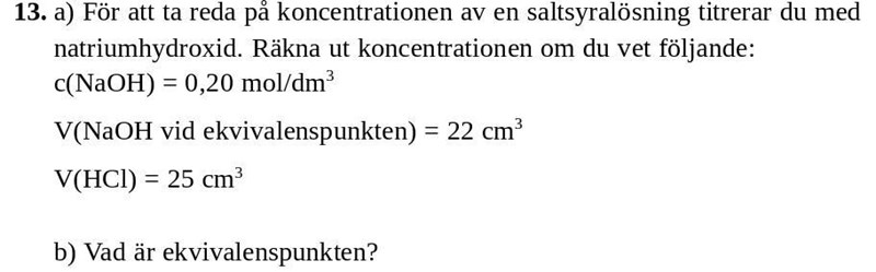 b) Ber dig beskriva vad ekvivalenspunkten är, vad begreppet ekvivalenspunkt betyder. Vilket du i princip gjort, du behöver dock skulle förtydliga vilka substansmängder som är ekvivalenta.