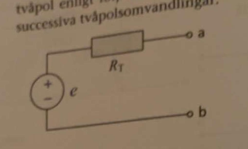Jag ska omvandla kretsen i bild 1 så att den blir ekvivalent enligt bild 2. Facit säger att svaret ska bli e=20v och RT=50ohm, däremot lyckas jag inte få fram detta svaret.