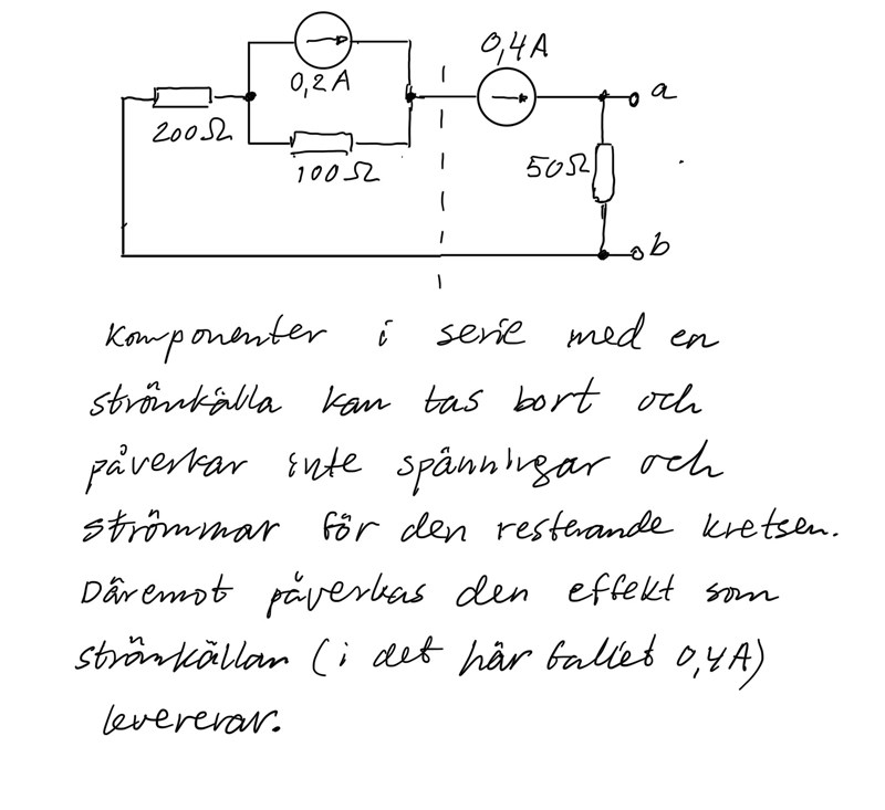 alltså om jag har förstått detta rätt inför framtida uppgifter, komponenter som är i serie med en strömkälla (även andra strömkällor i fall, som är parallelkopplad med 100ohm?) påverkas alltså inte?