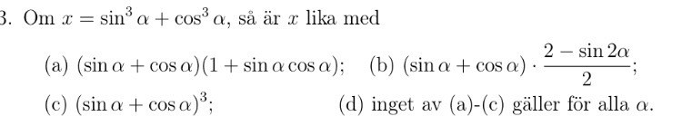 Redan nu ser vi att alternativ a och c inte kan komma på fråga. Vi känner också att intresset för b) ökar eftersom vi med sinus dubbla vinkeln kan skriva om x som