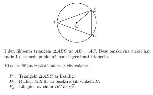 Börja med att anta att triangeln ABC är liksidig. Visa att i så fall gäller det att radien MB är en bisektris till vinkeln B. (Jag skulle anvmända mig av symmetriargument.) När du har gjort detta, bevisar du att om vinkeln ABC är liksidig så är längden av sidan BC lika med .