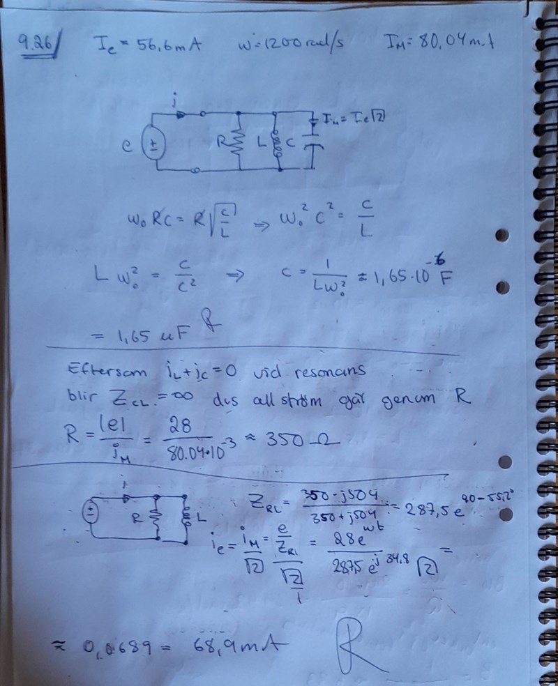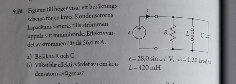 Jag har fumlat mig fram till C vilket blev rätt värde, men jag vet faktiskt inte alls hur jag ska få fram R. Vad jag förstått det som tar borde iL+iC=0 , men jag vet ju fortf inte vad i är och då vet jag inte hur jag ska få fram R.