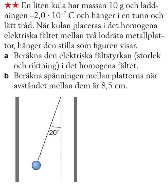 Om du ställer upp relationerna mellan krafterna korrekt så dyker tan 20 upp där, i form av förhållandet mellan den horisontella och den vertikala komposanten av trådkraften. Rita en triangel med de tre krafterna.
