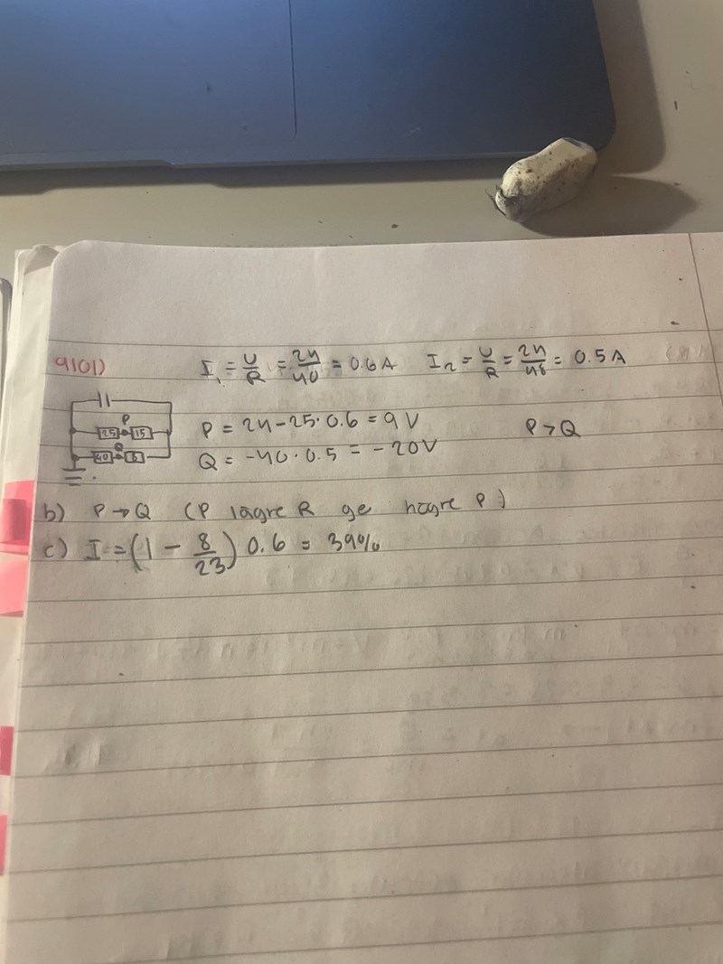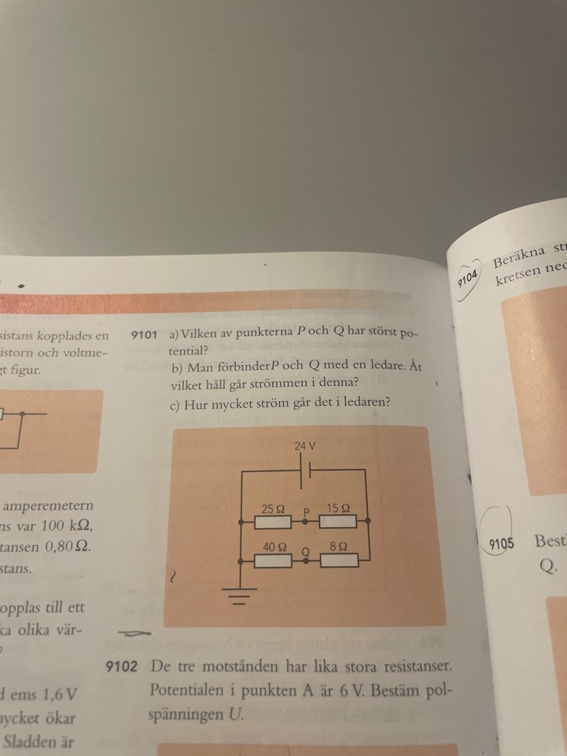 b = Undrar varför de väljer P->Q, är det för att det är lägre resistans vid Q? Hur kopplar man de till potential? Är det för att P är närmare + polen och därför har högre potential?