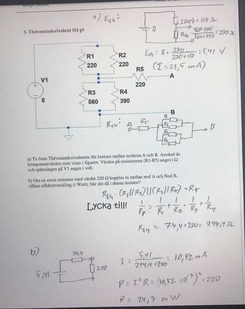 El lära: Kan någon kolla om jag har löst théveninekvivalenten och slinganalysen rätt?