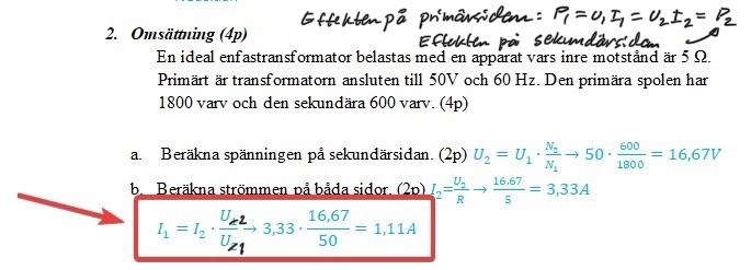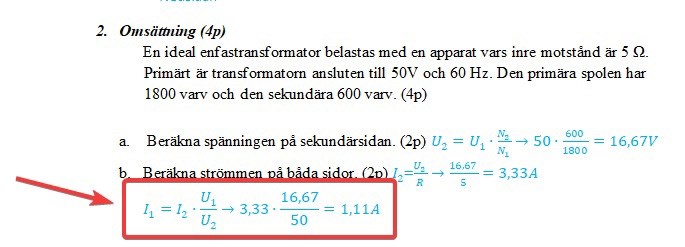 Någon som är bra på dessa uppgifter som kan kolla om detta facit är rätt. Enligt formeln så blir det ju 3.33*50/16.67= Ca 10 A. Vet inte om min lärare har skrivit formeln rätt då han skrivit att U2/U1.