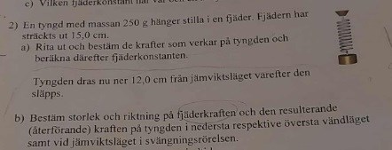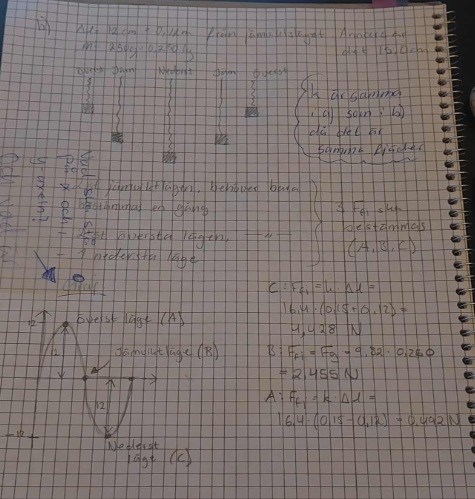 Hej! Jag ritade en sinuskurva för att försöka illustrera rörelsen av fjädern när den svänger upp och ner (se nedan, 2b). Det är 2 saker jag undrar över. För det första vet jag inte vad jag ska benämna x- och y-axeln. Dessutom vet jag inte hur jag ska gradera y-axeln i och med att jämviktsläget är när grafen skär x-axeln, dvs då y = 0. Däremot är vid jämviktsläget lika med 15 cm enligt uppgiften. Hur tänker jag i detta fall?