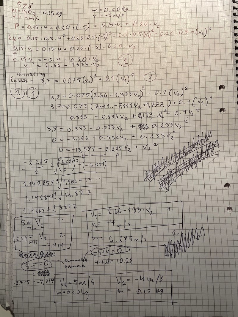En gummiboll med massan 150 g och hastigheten 4 m/s frontalkrockar med en annan gummiboll som har massan 200 g och hastigheten 5 m/s i motsatt riktning. Stöten är fullständigt elastisk. Vilka hastigheter fär bollarna efter stöten?