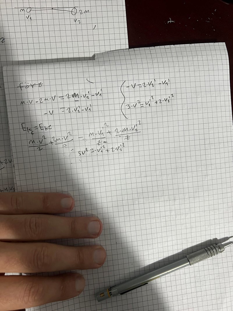 (1/2)(mv2 + 2mv2) = (1/2)(m(v’1)2 + 2m(v’2)2).