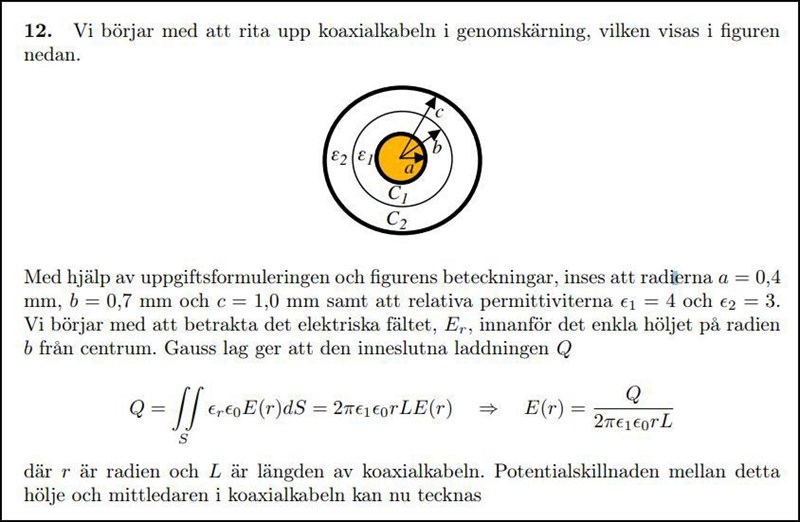 Inuti en antennkabel finns det en ledande kopparkärna med diametern 0,8 mm och ett ledande cylindriskt ytterhölje med innerdiametern 2,0 mm, allt omslutet av isolerande plast. Mellan ledarna finns det i en viss antennkabel, två lika tjocka isolationslager med relativa permittiviteterna 4,0 samt 3,0 räknat inifrån och ut. Hur stor kapacitans har koaxialkabeln per meter kabel?