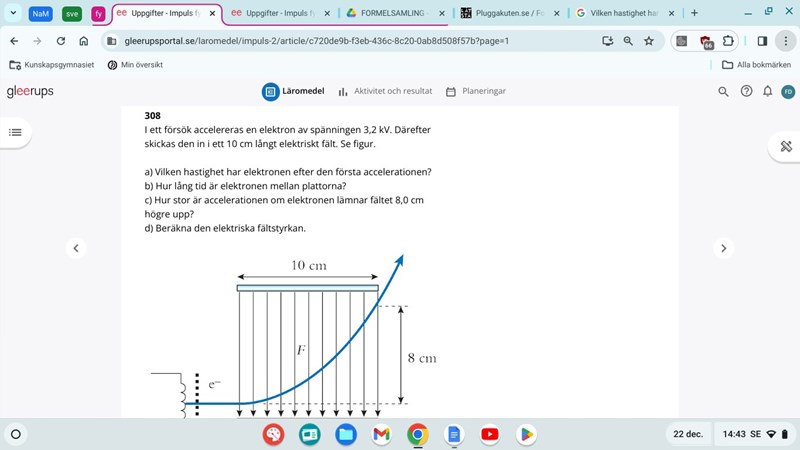 Mattehjalp skrev:a) Detta är jätte konstigt. Jag hade tänkt att jag ska ta reda på Fe och sätta lika med mv^2/2, precis som de gör. Dock tar de reda på Fe genom att ta e*U? jag hade tänkt att man gör det genom att ta E*e där e är 1,602*10^-19 och E=U/d där u=3,2kV och d=8 cm