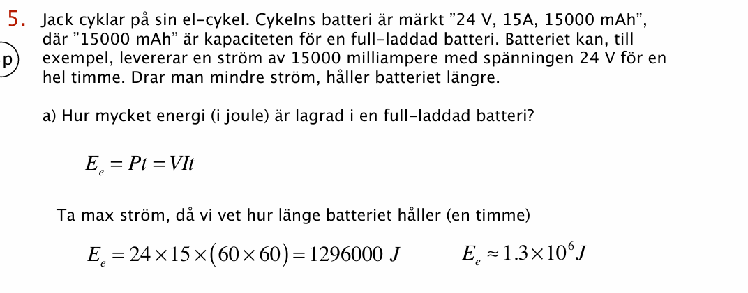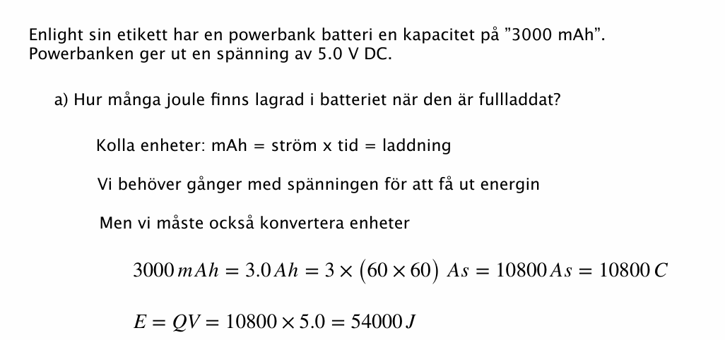 Så som svar fick jag att 15000 mAh *3.6= 54000 C. Sen spänning gånger ström (24*54000)=1 296 000 J. Det är ju då fel svar