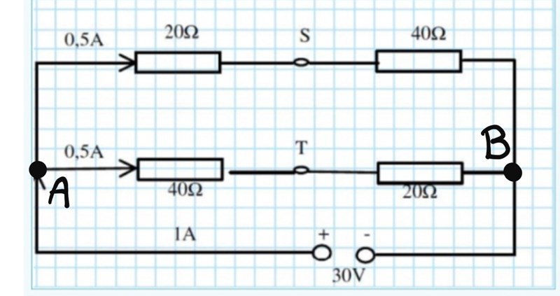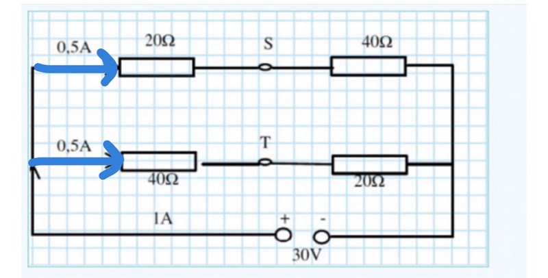 1. Från A, via motståndet på 20 Ω\Omega. Du går då i strömriktningen, varför passagen genom motståndet ger en minskning av potentialen. Denna minskning är 0,5*20 = 10 V och potentialen i S blir då 30 - 10 = 20 V.