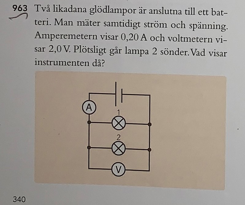 Dr. G skrev:Från början går det 0.2 A genom ampetemetern. Hälften av den strömmen (0.1 A) går genom vardera parallellkopplad lampa, då resistanserna är lika.