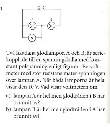 Jag vet att den totala spänningen är summan av spänningen över varje komponent i seriekopplingen, och eftersom glödlamporna är likadana så borde spänningen i lampa B vara 10 V som i lampa A. Så då borde den totala spänningen i kretsen bli 20 V.