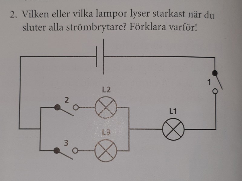 Jag tror att L2 och L3 lyser starkast, eftersom L1 är seriekopplad med både L2 och L3 och kommer därför lysa svagare. L1 är alltså seriekopplad till två parallella lampor medans L2 och L3 är seriekopplade med en lampa.