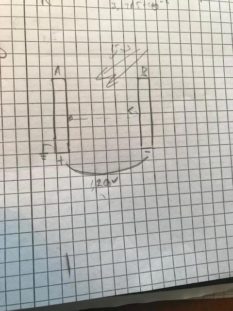 Mellan de två metallplattorna A och B i figuren kan de elektriska fältet anses homogent. Genom att belysa A med starkt ljus kan man frigöra elektroner ur den. När spänningen mellan A och B är 1,2 V, når de snabbaste elektronerna nätt och jämt fram till B för att sedan "falla" tillbaka mot A. Avståndet AB är 1,5 cm. rörelseenergi= 0,192 aj