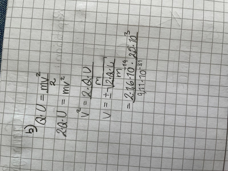 b) Hur stor hastighet får partikeln? Dess massa är 9,11*10-31kg.