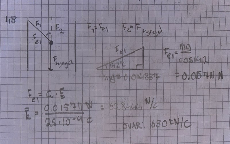 En liten kula med massan 1,514 g hänger i ett tråd i ett homogent horisontellt elektrisk fält. Kulans laddning är 25.0 nC, tråden (vars massa kan försummas) bildar en vinkel 19,2 grader med lodlinjen genom upphängningspunkten. Beräkna fältets styrka.