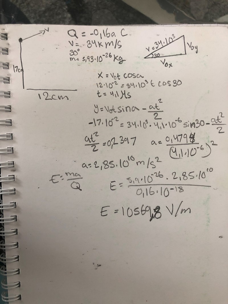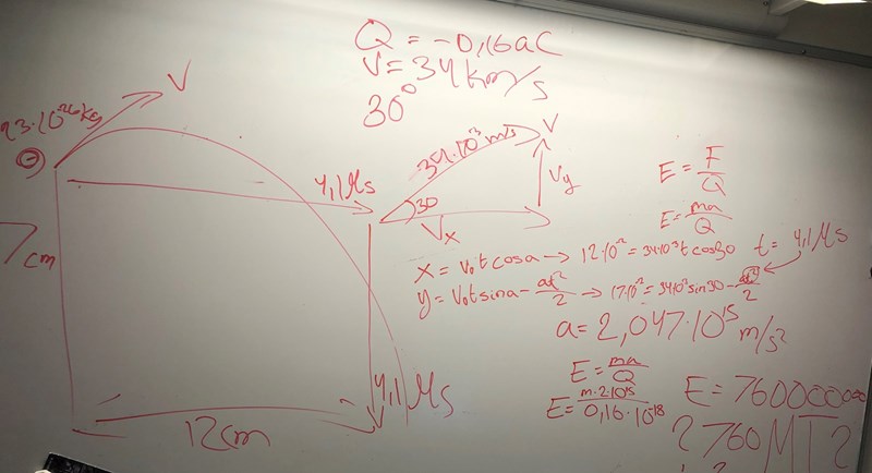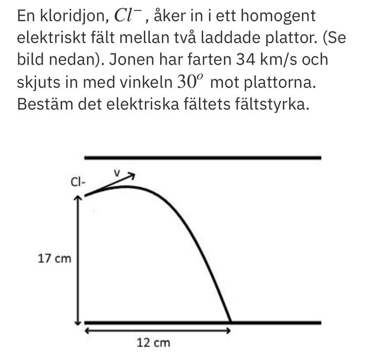Jag använde formeln x=v0tCos(a) för att få ut tiden som Cl är i rörelse och det tiden lägger jag sedan i formeln y=v0tSin(a) - at^2 /2 för att beräkna acceleration och sedan lägga det i Newtons andra lag och dividera med laddning för att få fältstyrkan men mitt svar blir 760x10^6 T vilket är för stort. Jag vet inte vad jag har gjort fel