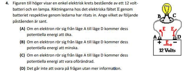 Hur kommer det sig att svaret blir A), förstår inte hur man tänker, är det för att potentialen blir högre om elektronerna rör sig en viss distans? Hur ska man tänka här.