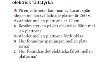 På B stod det oförändrat och c stod det ”c) Eftersom avståndet fördubblas halveras det elektriskafältet:1,1kV/m”