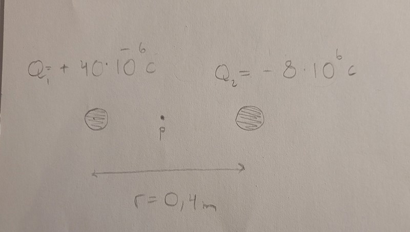 Punkten p är i mitten. Q1 är positiv och Q2 ä3 negativ. Rita ut fältstyrkan I mitten av punkten p.