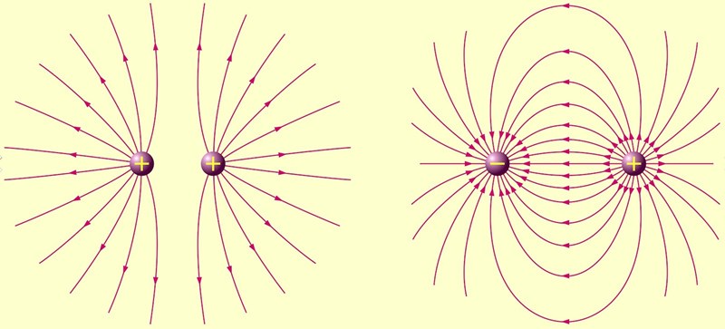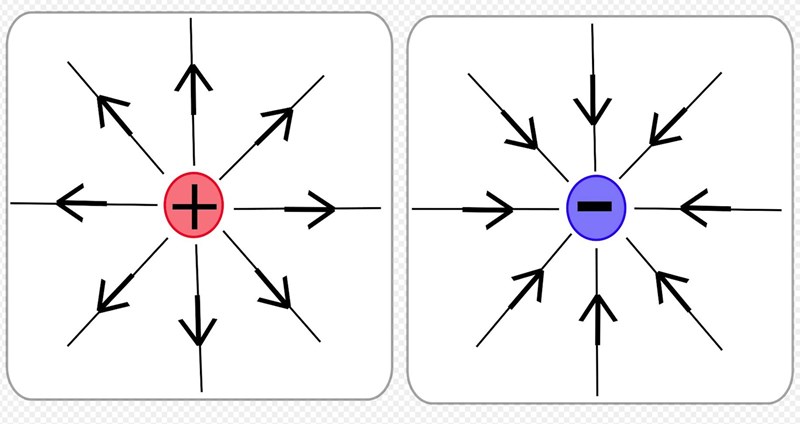 Om man har en ensam laddning (positiv eller negativ) så ser det elektriska fältet runt den ut så här: