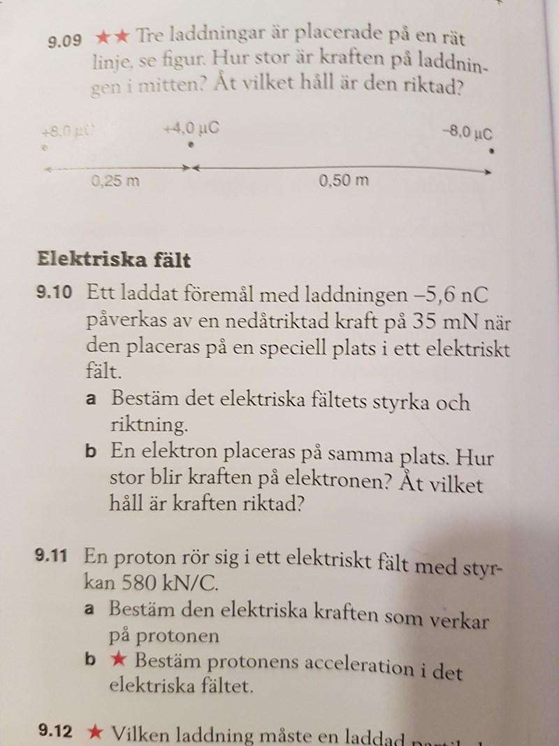fråga 9.10 , hur avgör jag riktningen ? Uppgiften säger att kraften är nedåtriktad. Jag tänker att iom att föremålet är negativt laddat verkar kraften nedåt i a,(attraherade riktning) eller c,(repellerande riktning). Hjälp mig tänka rätt