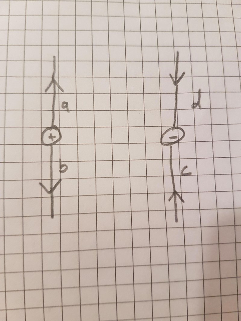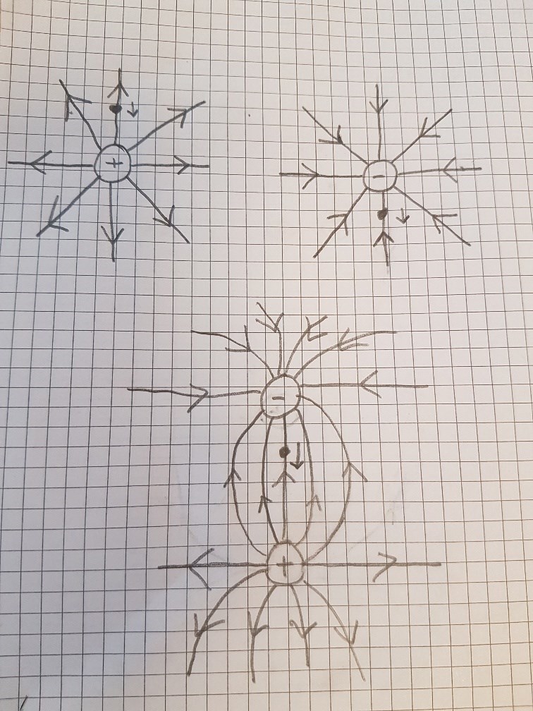 När du formulerar dig som du gör inser jag att fältet bör bli riktat uppåt, men som jag ser det är det bara en fältlinje som är riktad uppåt ? medans fältet är riktat åt alla möjliga håll, har ritat upp de tänkbara scenarion jag kan föreställa mig (med elektronen inritad).. antar jag missförstått begreppet elektriskt fält ?