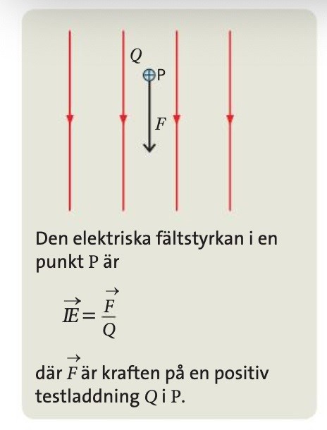 ”fältstyrkan i en punkt i ett elektriskt fält är den elektriska kraften F på en positiv laddning Q som placeras i punkten, dividerad med laddningens storlek”