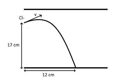 nedan). Jonen har farten 34 km/s och skjuts in med vinkel 30.0 grader mot plattorna. Kloridjonen väger 5,93 · 10^-26 kg och har laddningen −0,16 aC.