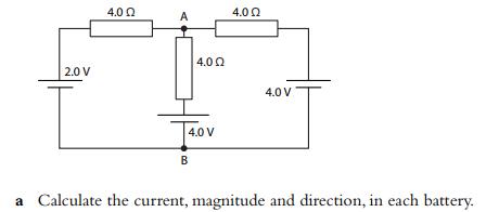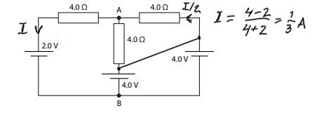 Jag tänkte mig en ström som löper från 2-voltscellen medurs. Då "anländer" ju strömmen från samma riktning till de båda resistorerna. Eller ska man prioritera den ström som kommer från cellen i mitten och tänka sig att strömmen går i motsatt riktning?