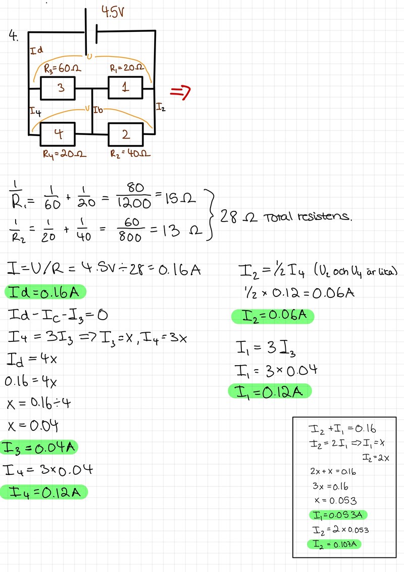 Tack för svaret! Jag har nu räknat ut I3 och I4. För I2 och I3 blev den totala ström mer än Id vilket jag inte tror stämmer. Jag försökte att göra på ett annat sätt i rutan nedan, passar det bättre?
