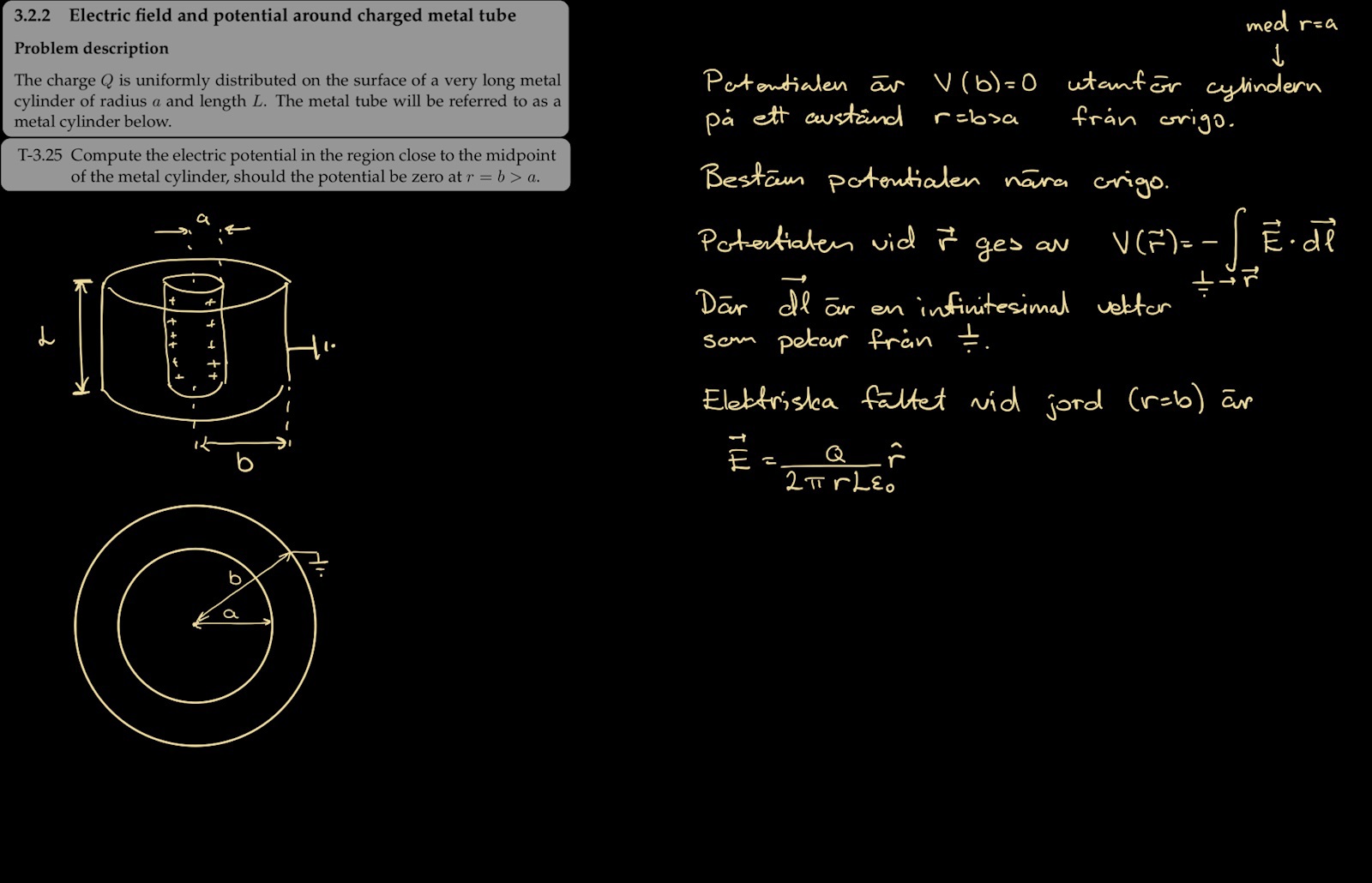 Jag tänker att jag ska använda formeln för VrV\left( \vec{r} \right), problemet är om vi ska gå hela vägen från jord till origo (innanför cylindern med radie a) så är det elektriska fältet inuti 0. Hur gör jag med integralen då? jag kan beräkna fram till det att vi når ytan av cylinder med radie a
