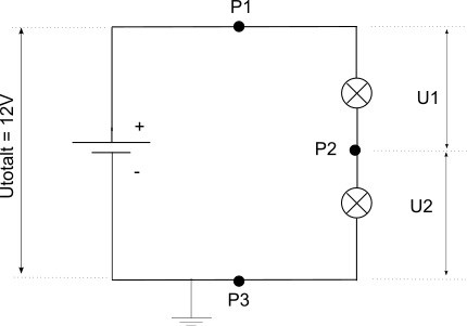 Spänningsfallet från P1 till P3 är alltså 12 V.