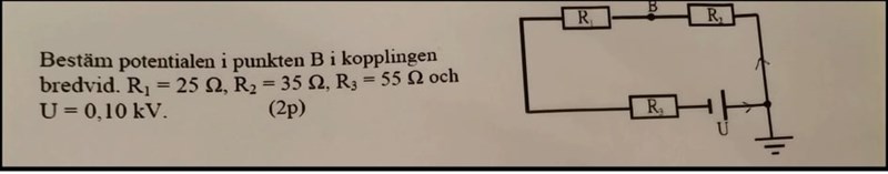 Svar: -122.5V är potentialen vid punkten B.