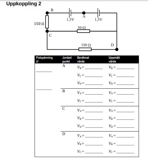 Ett batteri har alltid en potentialskillnad mellan polerna. T.ex i fallet med A som jordpunkt så blir Vb 1.5V och VD -1.5V.