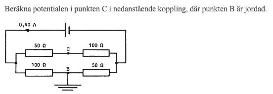 Hej! Förstår verkligen inte hur jag ska lösa denna. Jag började med att dela upp strömmen i grenarna så varje gren får 0,2A eftersom motstånden är lika. Sedan ska man väl använda formeln R=U/I. Hur ska man göra härifrån och är potentialen från punken C till jorden eller till strömkällan. Har inte riktigt förstått vad potential innebär? Tack på förhand!