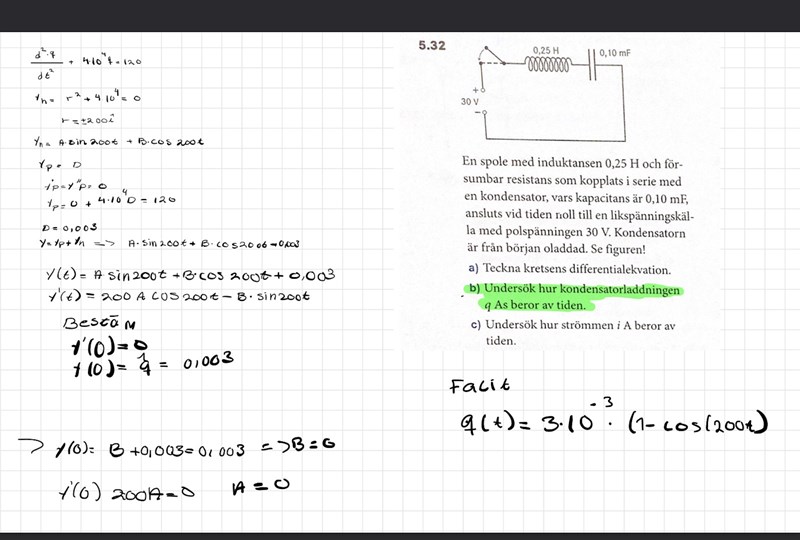 jag känner till att resistansen är försumbar, q(0)=c•u q’(0)=0